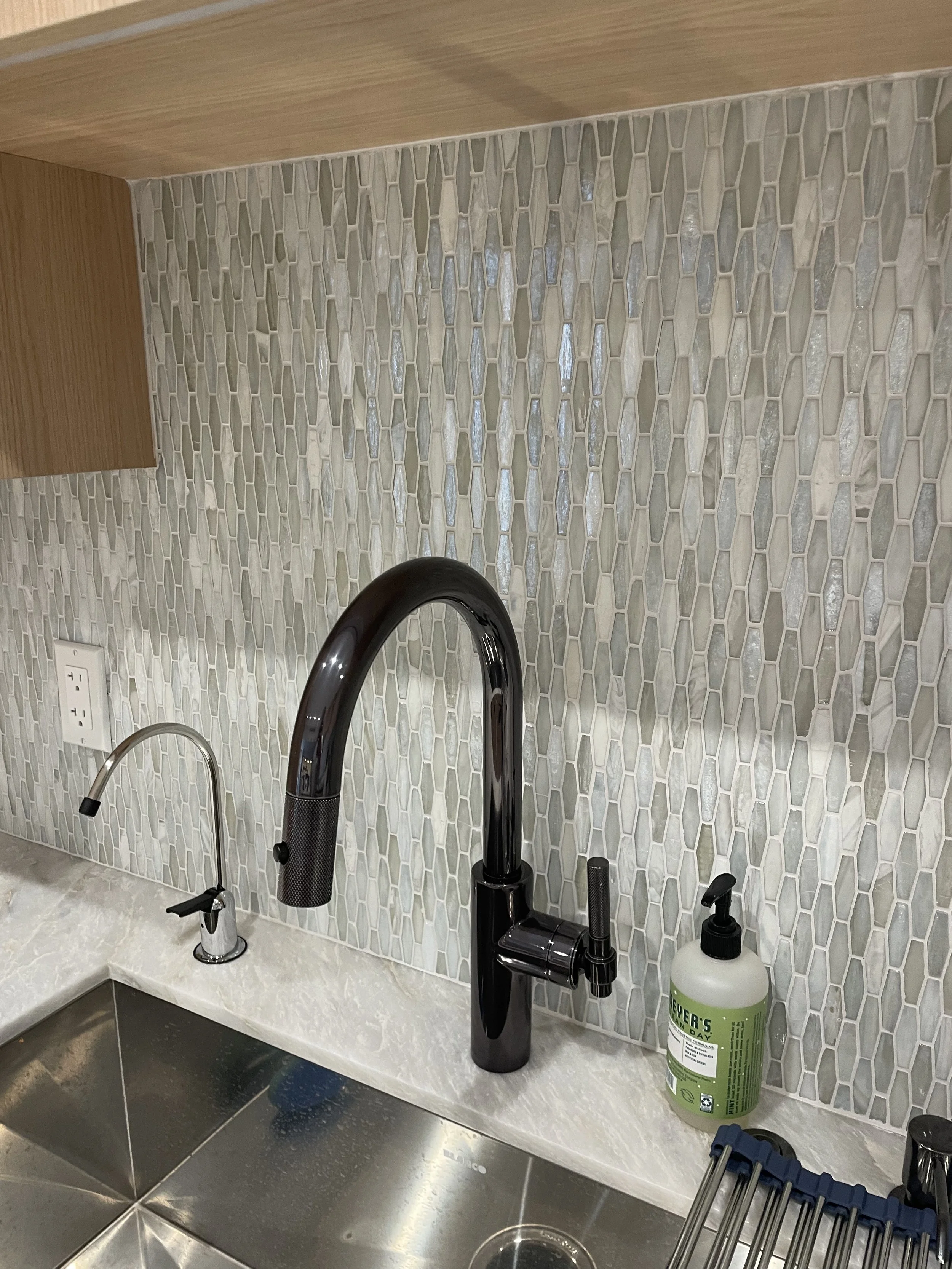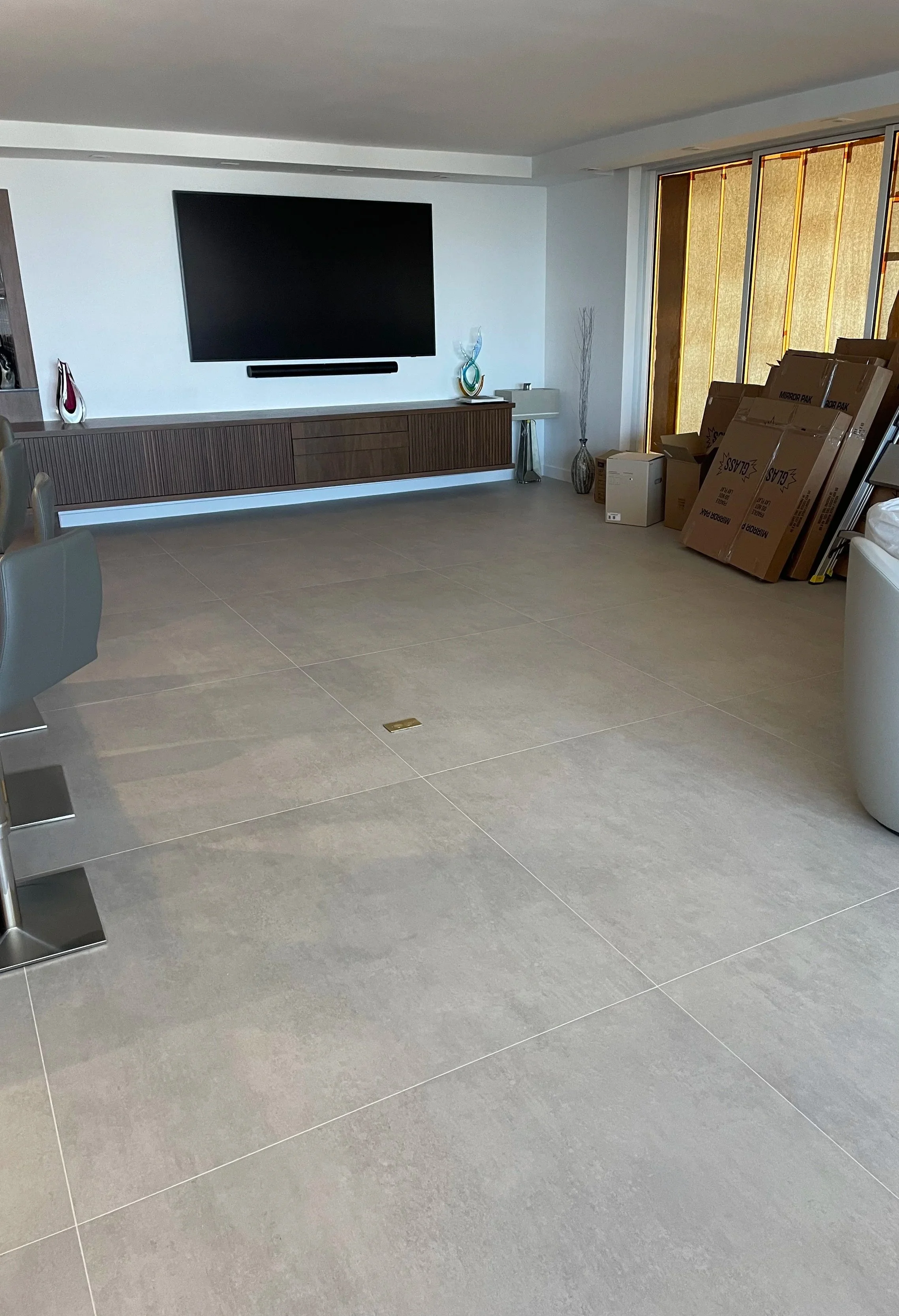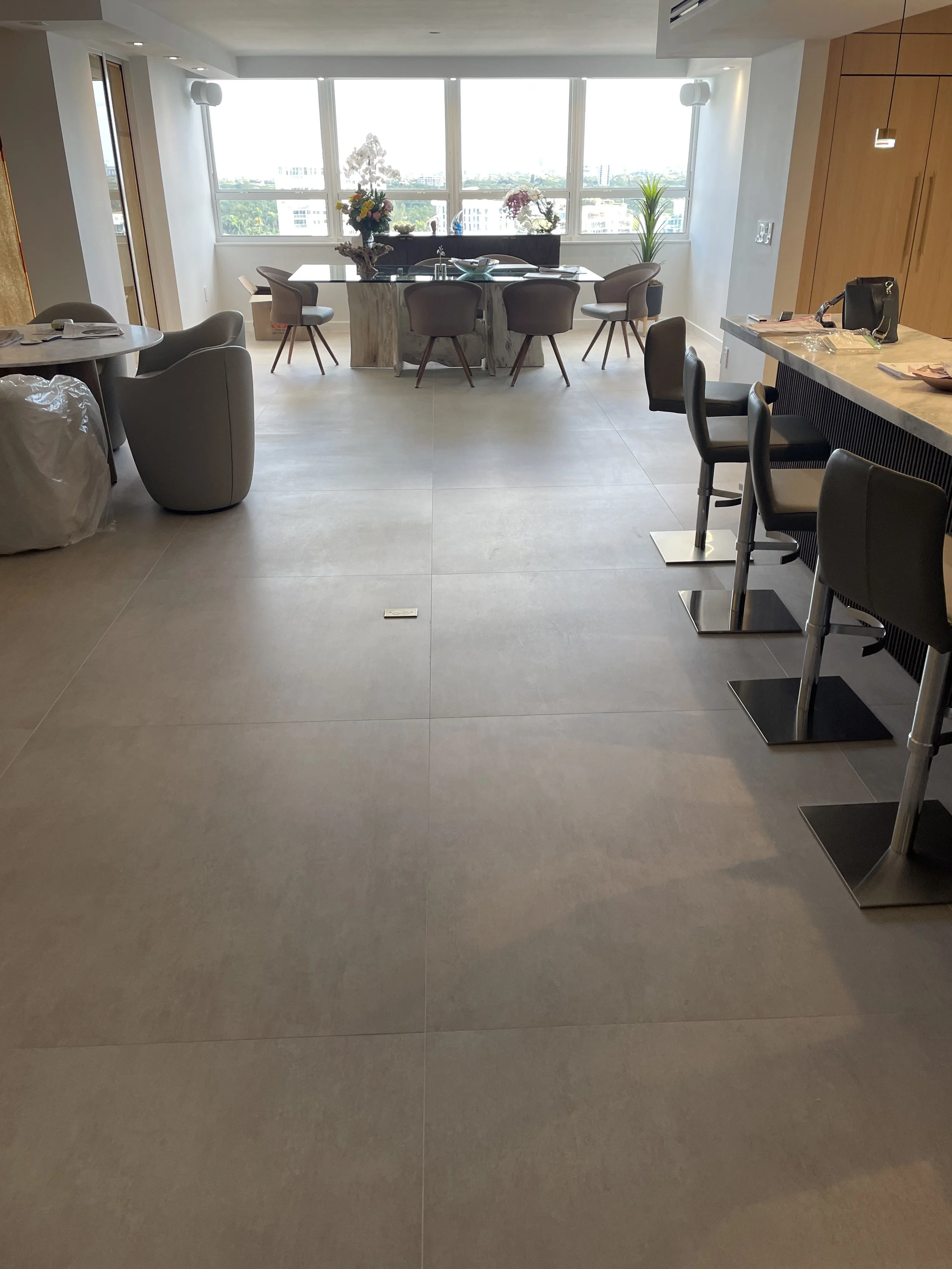 This remodel features elegant 48”x48” gray concrete-look tiles that bring a clean, modern aesthetic to the floor while enhancing the sense of space. The look is completed with a custom mosaic backsplash, adding depth, texture, and a touch of artistry for a striking, high-end finish.